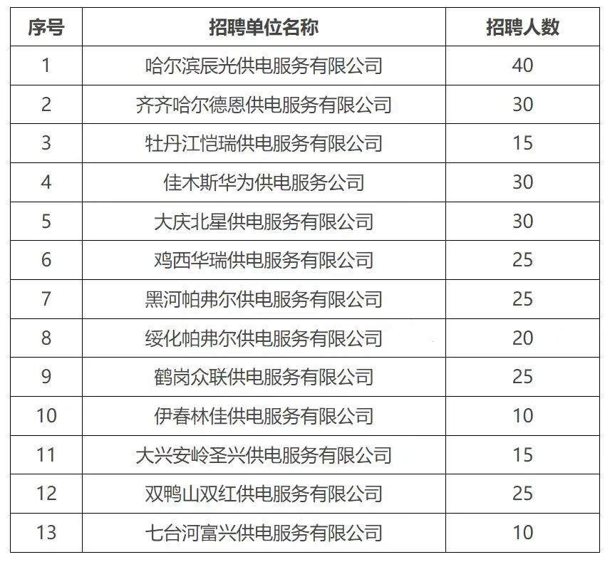 為進(jìn)一步提高鄉(xiāng)村供電服務(wù)水平,結(jié)合供電服務(wù)公司發(fā)展需求,充實基層供電服務(wù)力量,黑龍江省各地供電服務(wù)公司組織開展2024年供電服務(wù)職工招聘工作,現(xiàn)將有關(guān)事項公告如下: